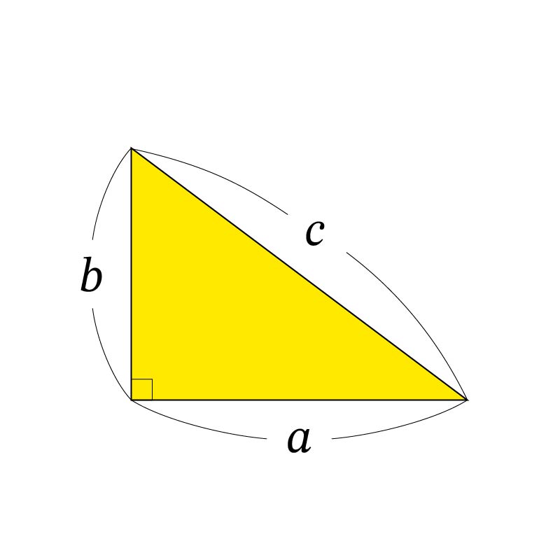 直角三角形において、直角をはさむ2つの辺の長さを a, b、一番長い辺(斜辺)の長さをcとすると、次の関係が成り立ちます。